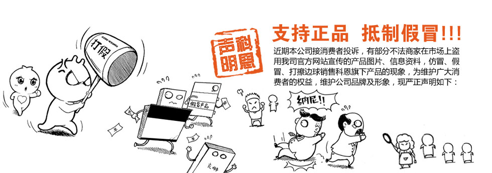 特此聲明:本公司對(duì)已發(fā)現(xiàn)的偽劣、仿冒和假冒科恩產(chǎn)品逐步曝光,希望廣大消費(fèi)者提高警惕,避免不必要的損失,對(duì)提供舉報(bào)線索的用戶本公司給予重獎(jiǎng)。