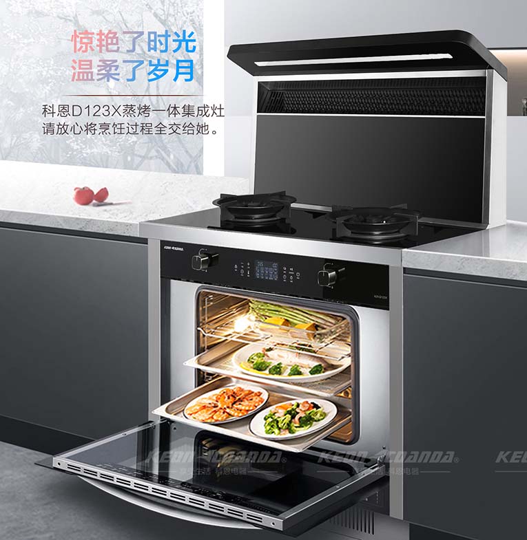 科恩D123X變頻蒸烤消一體智能集成灶為什么頗受消費(fèi)者的喜愛(ài),原因有以下幾方面:1.省空間:科恩D123X集合煙機(jī)、燃?xì)庠?、蒸箱、烤箱、消毒柜等多種功能于一體,不僅節(jié)省空間還能省下一米櫥柜空間。2.吸油煙能力強(qiáng):比起傳統(tǒng)煙機(jī),科恩D123X離灶臺(tái)距離更近,吸力更強(qiáng),在油煙產(chǎn)生的第一時(shí)間就可以將其吸走,另外油煙的過(guò)濾網(wǎng)采用不沾油特氟龍材料,易清洗、耐高溫、抗腐蝕!3.大火力爆炒:尤其是爆炒菜,D123X鑄鐵鍋架帶雙聚能環(huán)設(shè)計(jì),四通道獨(dú)立引射5.0KW大火力猛火爆炒,寬裕立體上進(jìn)風(fēng)充分燃燒,提高燃燒效率,降低一氧化碳排放。