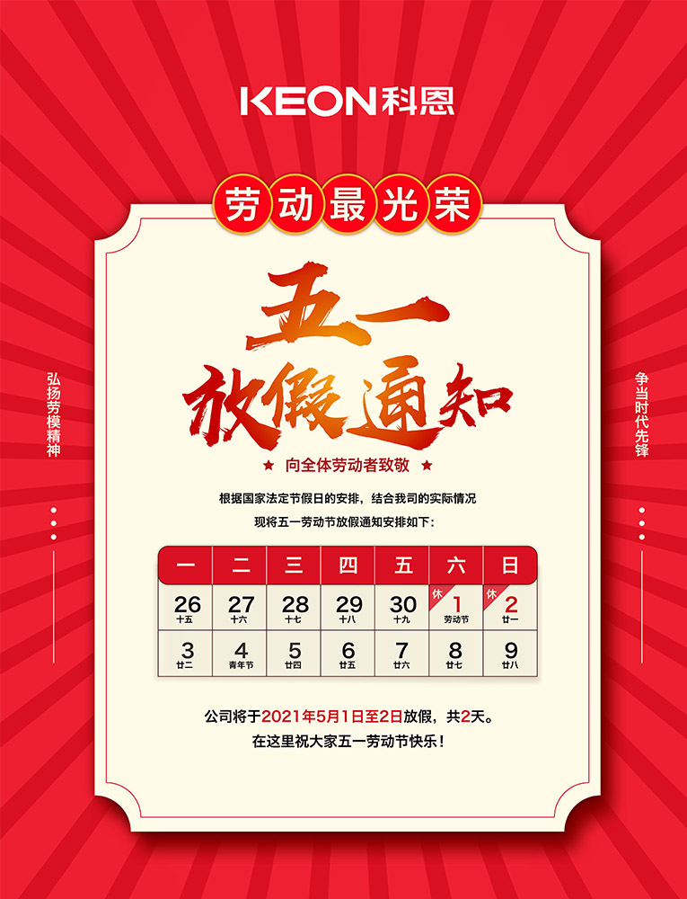 2021年度五一國際勞動節(jié)將至,在此首先向科恩電器分布于全國各地的經(jīng)銷商合作伙伴致以最誠摯的祝福與感謝!同時,公司結(jié)合2021年生產(chǎn)進(jìn)度、運(yùn)營規(guī)劃、現(xiàn)將五一放假安排通知如下: