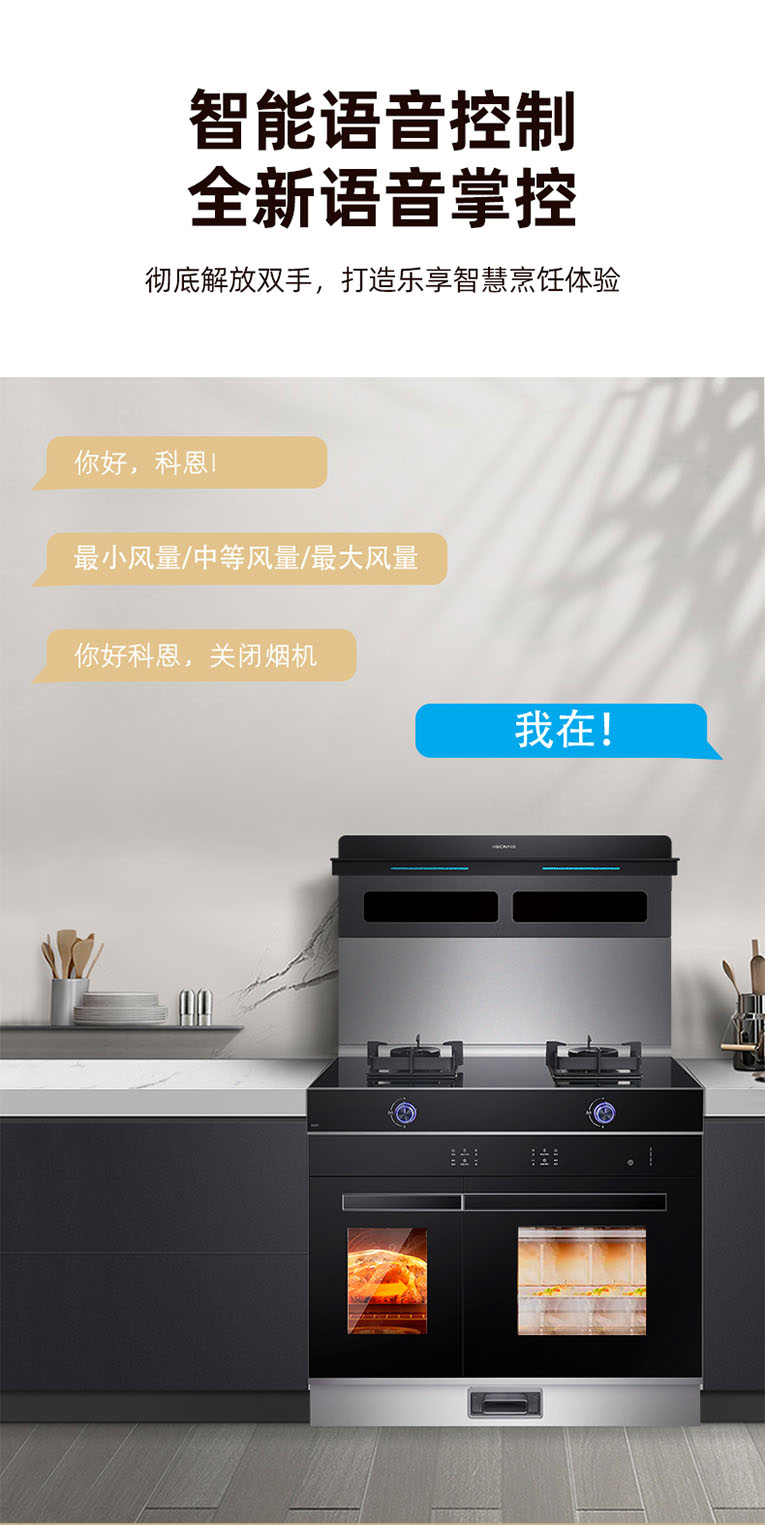 另外,集成灶十大品牌、廚電行業(yè)十大品牌科恩S450左右蒸烤集成灶還擁有智能語(yǔ)音控制,“你好科恩!最小風(fēng)量/最大風(fēng)量/最大風(fēng)量;你好科恩!關(guān)閉煙機(jī)”,全新語(yǔ)音掌控徹底解放雙手。智能變頻巡航20m3/min低空近吸,低空封鎖油煙升騰區(qū),吸凈雙灶爆炒煙,杜絕油煙倒灌,遇堵排煙強(qiáng)效節(jié)能,高樓排煙快!在火力方面,擁有穩(wěn)定而暢快的火力是非常好的烹飪體驗(yàn),小火煲湯、大火爆炒,烹飪出舌尖上不同的美味,科恩S450左右蒸烤集成灶具備5.2kW猛火爆炒,聚能火力加持,火焰更集中,大火小火皆在掌控之間,煎炸蒸炒毫無(wú)壓力。