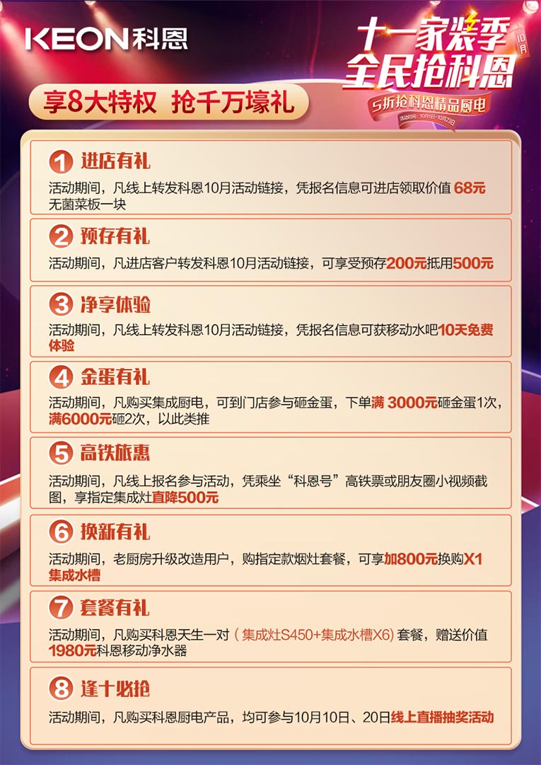 10月1日——10月23日,集成灶十大品牌、廚電行業(yè)十大品牌科恩集成灶“十一家裝季 全民搶科恩”活動開啟,終端活動玩法升級、福利加碼,打造金秋十月盛大福利狂歡盛宴,讓更多人能有機(jī)會享受到科恩集成灶十月活動帶來的福利。進(jìn)店有禮、預(yù)存有禮、凈享體驗(yàn)、金蛋有禮、高鐵旅惠、換新有禮、套餐有禮、逢十必?fù)尯蓝Y巨獻(xiàn)。