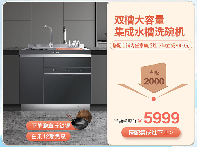 雙11搭配購(gòu)實(shí)惠,集成水槽洗碗機(jī),清洗、保潔、收納、存放四合一,給您不一樣的廚房樂(lè)趣,科恩KN0A3集成水槽洗碗機(jī)雙11直降2000,活動(dòng)搭配價(jià)僅需5999;