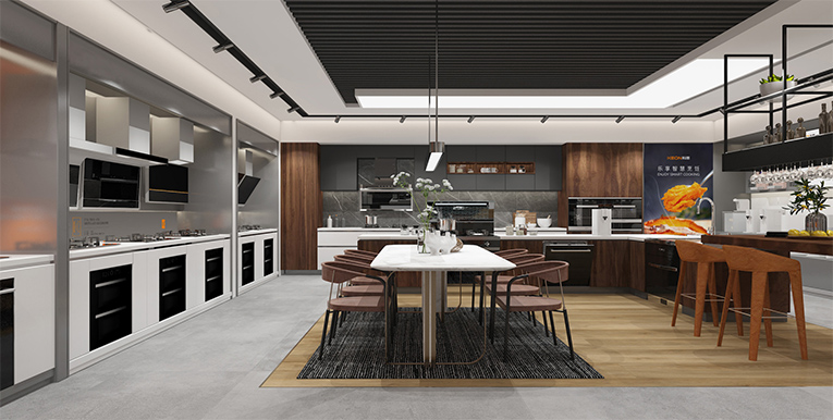 科恩新門店簡約、大氣、精美的視覺沖擊讓人印象深刻,開放式瀏覽路徑,通過“視覺+產(chǎn)品+體驗(yàn)”的融合,以差異化彰顯品牌個(gè)性,讓消費(fèi)者通過感知產(chǎn)品來感受品牌,對(duì)多個(gè)區(qū)域進(jìn)行場景重構(gòu),產(chǎn)品陳列區(qū)、廚房場景、品牌背書、洽談區(qū)等,通過模塊化的方式,將核心產(chǎn)品模塊以及開放式廚房體驗(yàn)場景植入門店。