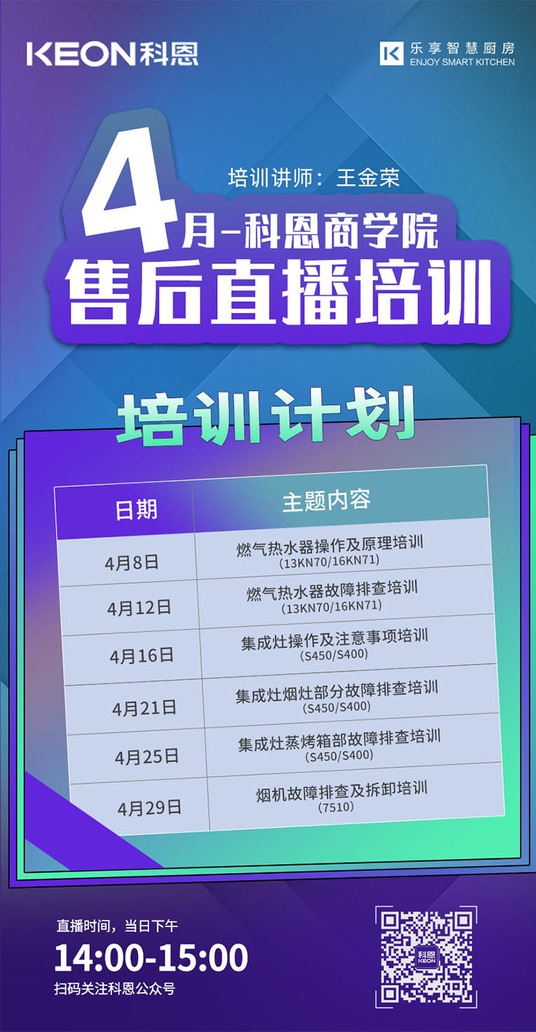 勤修內(nèi)功,強(qiáng)化技能,提升自我!集成灶十大品牌、廚電行業(yè)十大品牌科恩集成灶4月線上直播培訓(xùn)總覽,儲(chǔ)備知識(shí),保障團(tuán)隊(duì)凝聚力和戰(zhàn)力力,上下齊心,打造黃金團(tuán)隊(duì),擴(kuò)大品牌影響力!