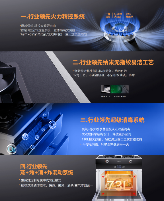 C系列集成灶配備的四項行業(yè)領(lǐng)先創(chuàng)新技術(shù):火力精控系統(tǒng)、納米無指紋易潔工藝、超級消毒系統(tǒng)、蒸烤消炸混動系統(tǒng)——直擊當(dāng)下消費(fèi)痛點(diǎn),徹底解決用戶使用需求,從大火力大吸力、易清潔易打理、廣收納懂消殺、多功能全集成四個維度力破當(dāng)下行業(yè)四大頑固堵點(diǎn)。