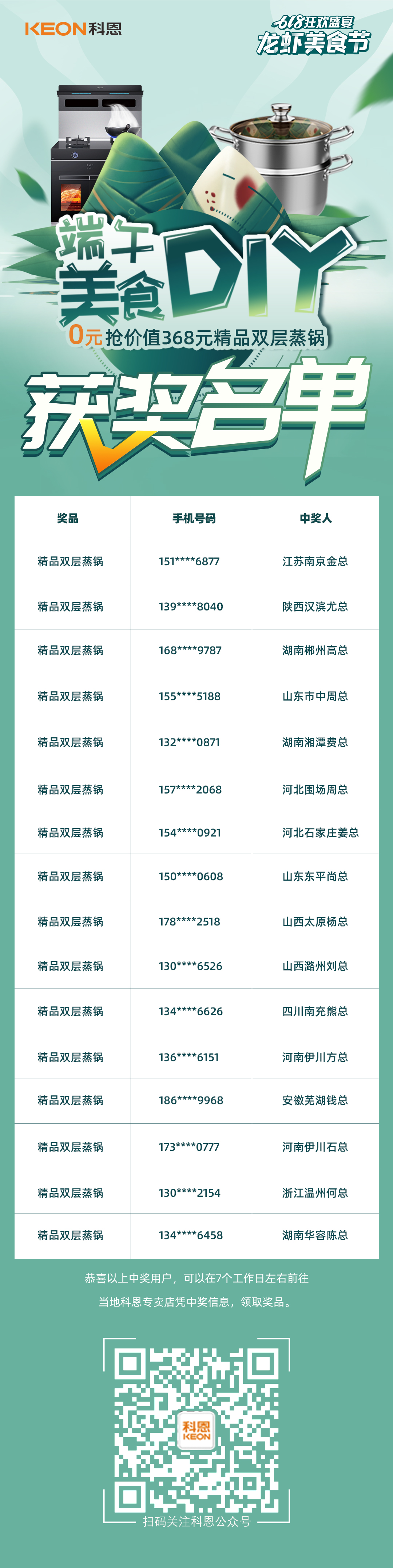 什么?你竟然錯(cuò)過了這場精彩紛呈的現(xiàn)場直播?麻辣小龍蝦粽子也太厲害了吧!還有0元搶好禮和1元特權(quán)卡,這種薅羊毛機(jī)會下次一定不能錯(cuò)過!除了端午美食DIY——學(xué)做小龍蝦粽子之外,現(xiàn)場還有0元搶價(jià)值368元精品雙層蒸鍋,話不多說,先上獲獎名單,看看你中獎了沒?