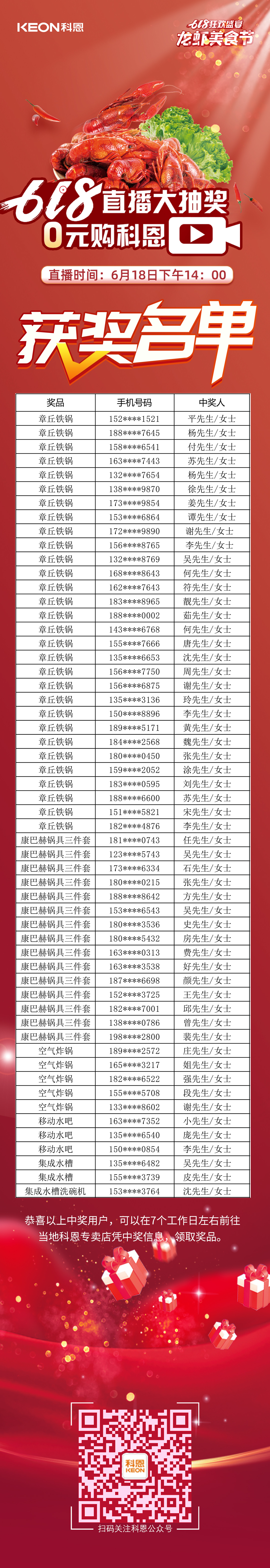 萬人品美食,0元搶科恩——科恩龍蝦美食節(jié)圓滿落幕,千城千店,共襄盛舉,感謝大家對科恩集成灶的大力支持,618直播大抽獎獲獎名單火熱出爐,恭喜以上獲獎的小伙伴們,請盡快聯(lián)系當(dāng)?shù)?a href="http://www.usg0v.com/" target="_blank">科恩門店,快把獎品領(lǐng)回家吧!