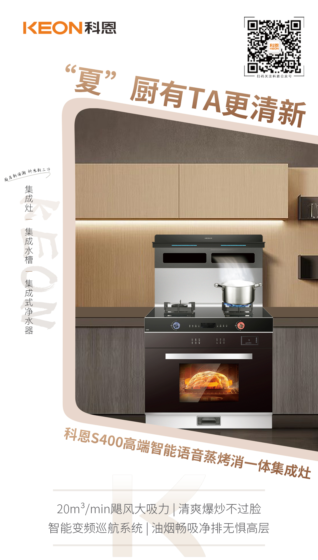 每一次下廚時的揮汗如雨,都是對愛的最好詮釋!科恩S400高端智能語音蒸烤消一體集成灶,20m3/min颶風(fēng)大吸力,720Pa大風(fēng)壓,瞬吸惱人油煙,清爽爆炒不過臉,當熱浪遇見清風(fēng),悶熱煩躁一吹就散了,只留下如春風(fēng)細雨般溫然如潤,智能變頻巡航系統(tǒng),化身“斗暑圣戰(zhàn)士”,油煙暢吸凈排,無懼高層,烹飪高峰亦可游刃有余,于酷暑中守護家人的一日三餐!
