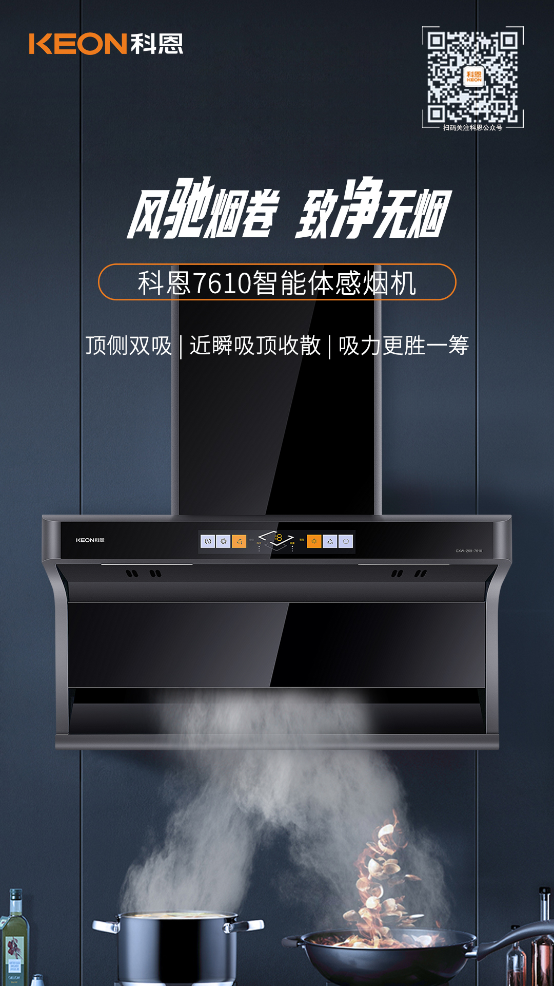 廚房有煙火,家里有溫度,科恩7610頂側(cè)雙吸平板煙機(jī),用心呵護(hù)著柴米油鹽里的浪漫!
