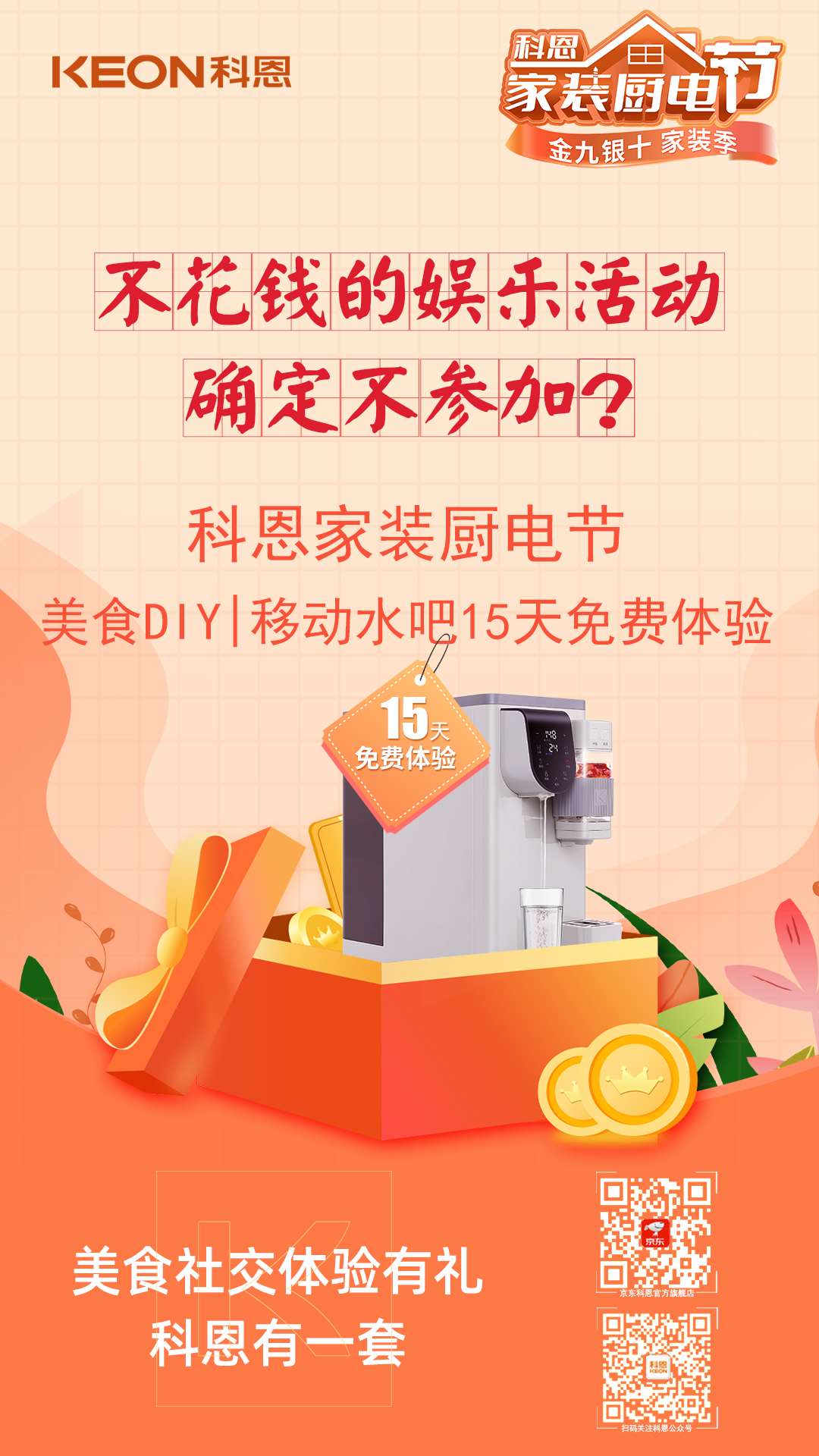 明天就是周末了,別只在家擺爛!可逛街費(fèi)錢,宅家費(fèi)電,有沒有什么不花錢又能carry全場的娛樂活動?來科恩家裝廚電節(jié),場地、設(shè)備、機(jī)器早已準(zhǔn)備就緒,美食DIY,沉浸式體驗(yàn),共同制作美食,一起分享心得,還有15天免費(fèi)體驗(yàn)的移動水吧帶回家,美食社交,體驗(yàn)有禮,確定不參加?