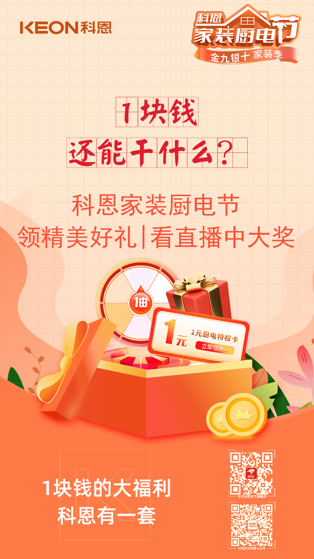 金九銀十家裝季,科恩家裝廚電節(jié),1元特權(quán)卡,樂享六喜禮,福利連連,驚喜不斷,趁此機(jī)會,用更優(yōu)惠的價格購得稱心如意的廚電好物,年前入住美滋滋!
