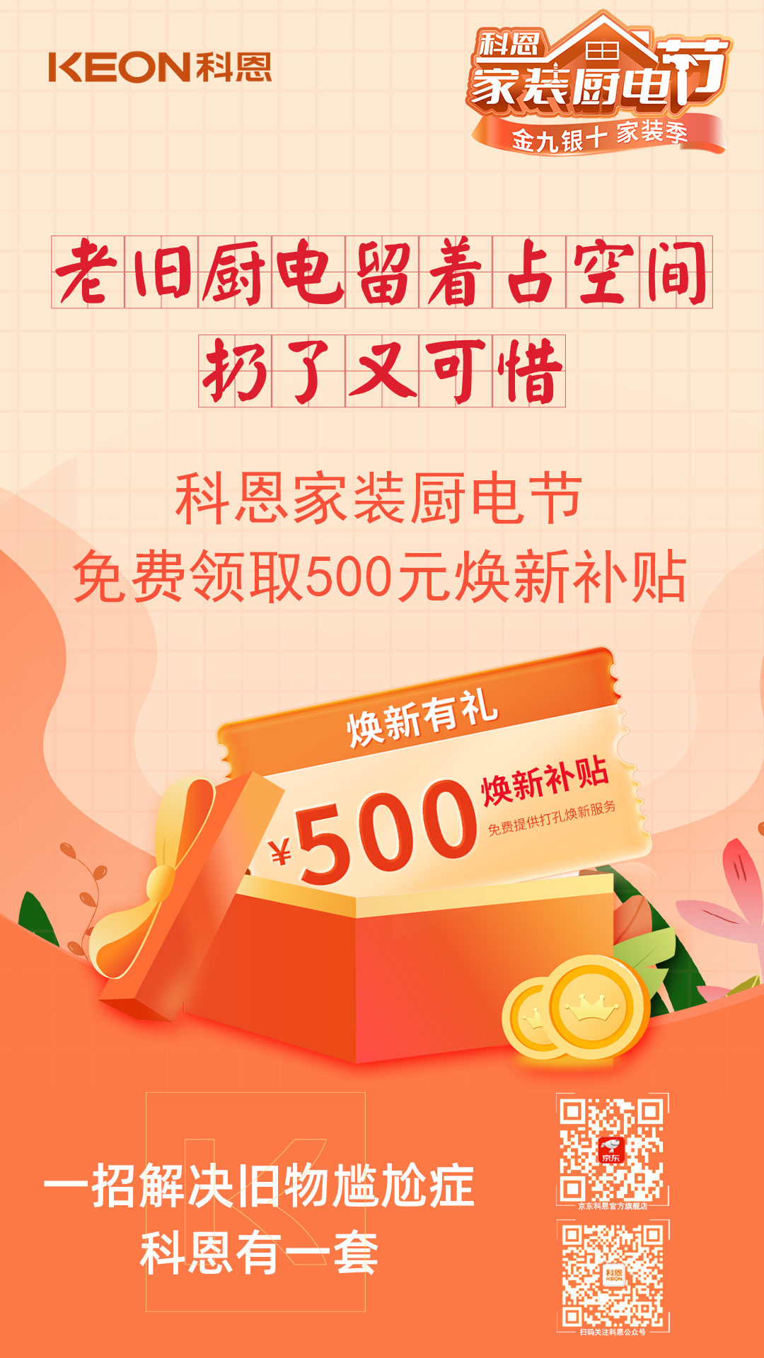 用了好多年的老舊廚電,不僅耗能大,放在家里更顯臟亂差,爸媽不舍得換,留著占空間,扔了又可惜,就這樣將就湊合過了一年又一年,恰逢其時,參與科恩家裝廚電節(jié),免費(fèi)領(lǐng)取領(lǐng)取超值煥新煥新補(bǔ)貼,告別老舊廚電,開啟美好生活,一招解決舊物尷尬癥,科恩有一套!