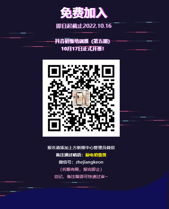 目前,第五期抖音實(shí)戰(zhàn)訓(xùn)練營初級(jí)班已全面啟動(dòng),欲報(bào)從速!歡迎在此留言報(bào)名或者添加科恩新媒體官方微信搶占名額!科恩新媒體官方微信:zhejiangkeon