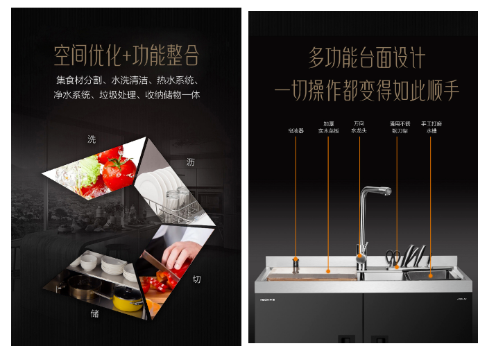 空間優(yōu)化+功能整合,集食材分割、水洗清潔、熱水系統(tǒng)、凈水系統(tǒng)、垃圾處理、收納儲物于一體,多功能臺面設(shè)計,皂液器、加厚實木菜板、萬向水龍頭、通用不銹鋼刀架、手工打磨水槽等功能,每一處細(xì)節(jié)堪稱完美,整體造型優(yōu)美別致,同時兼顧實用性。
