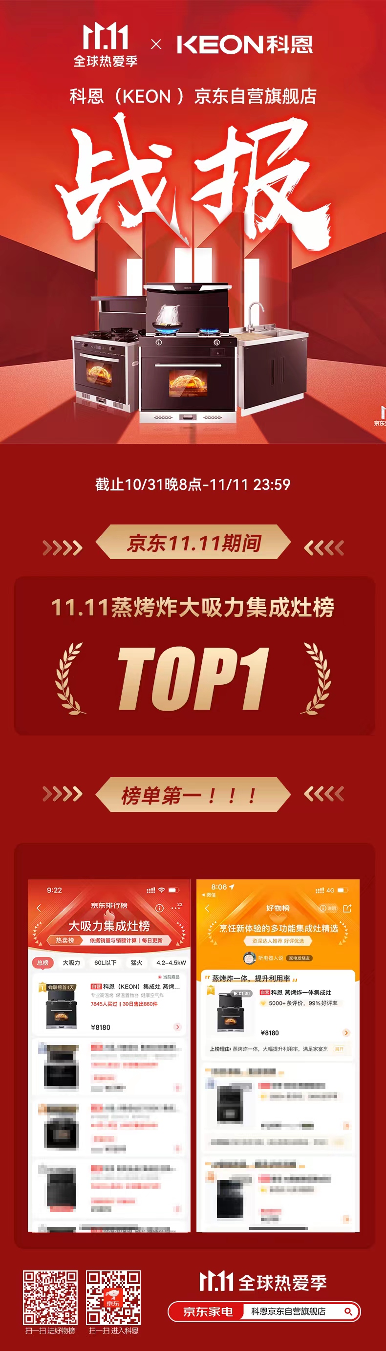 雙11全民狂歡盛宴完美落幕,科恩集成灶雙11終極戰(zhàn)報來襲,科恩集成灶火力全開,斬獲雙料第一:蒸烤炸大吸力集成灶榜TOP1,烹飪新體驗多功能集成灶TOP1,強(qiáng)大品牌號召力毋庸置疑,科恩速度,實力盡顯!
