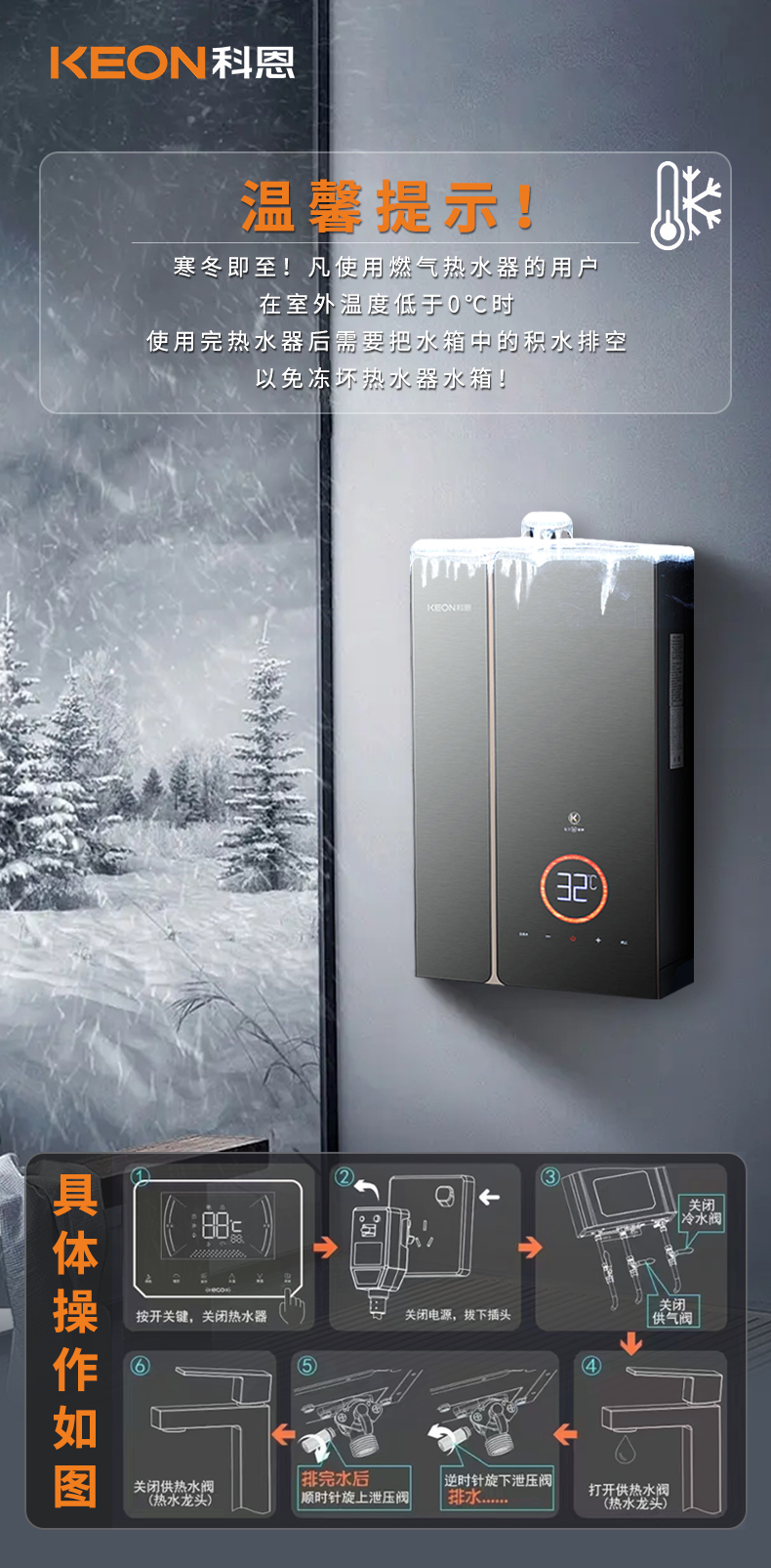 寒冬將至!當(dāng)室外溫度低于0℃時,使用完熱水器后,若不及時將熱水器里的水排干凈,冷空氣變會倒灌進(jìn)熱水器內(nèi)部,水結(jié)冰后體積膨脹,容易凍壞熱水器水箱,造成不必要的麻煩和損失!因此,做好熱水器的防凍措施非常有必要!