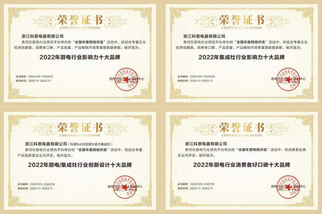 自2022年廚電/集成灶品牌推薦活動(dòng)啟動(dòng)以來,經(jīng)過企業(yè)篩選、資格初審、后臺(tái)評(píng)論、留言推薦、數(shù)據(jù)核對(duì)、綜合評(píng)審等階段??贫麟娖鲬{借強(qiáng)大的綜合實(shí)力和品牌影響力在廚電行業(yè)資訊平臺(tái)評(píng)選中脫穎而出,斬獲“十大品牌”四大殊榮!