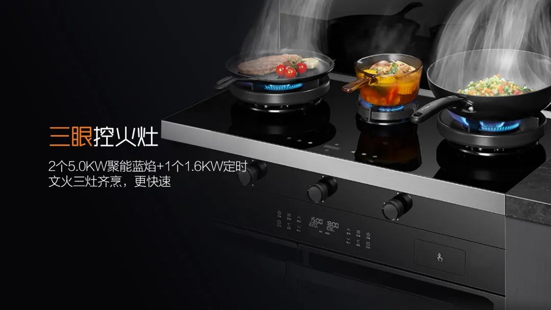 科恩A3系列獨特的三眼控火灶設(shè)置,可完美適配三代同堂家庭,2個5.0KW聚能藍(lán)焰+1個1.6KW定時文火,同時滿足爆炒和煮輔食的需求。且1.6KW小火慢煮,讓輔食擁有自己的專屬火力,無需費(fèi)力調(diào)整,開啟就是最佳火力。