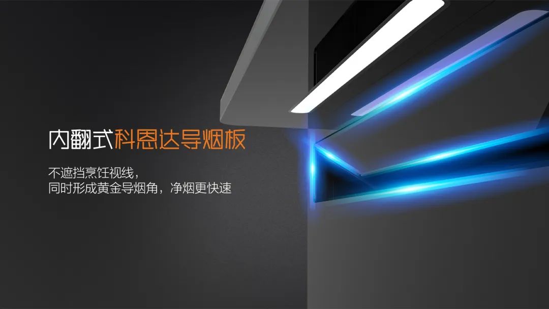 特有的內(nèi)傾科恩達(dá)導(dǎo)煙網(wǎng)板不遮擋視線,且形成獨特的吸煙黃金角,讓油煙在鍋口就被吸走,0跑煙,廚房更清新!
