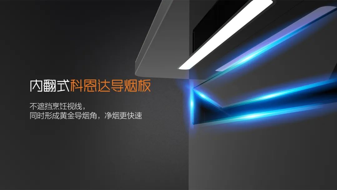 內(nèi)傾科恩達(dá)導(dǎo)煙網(wǎng)板,智能開合,獨有黃金吸煙角,不擋視線,吸煙更給力,烹飪更寬敞。