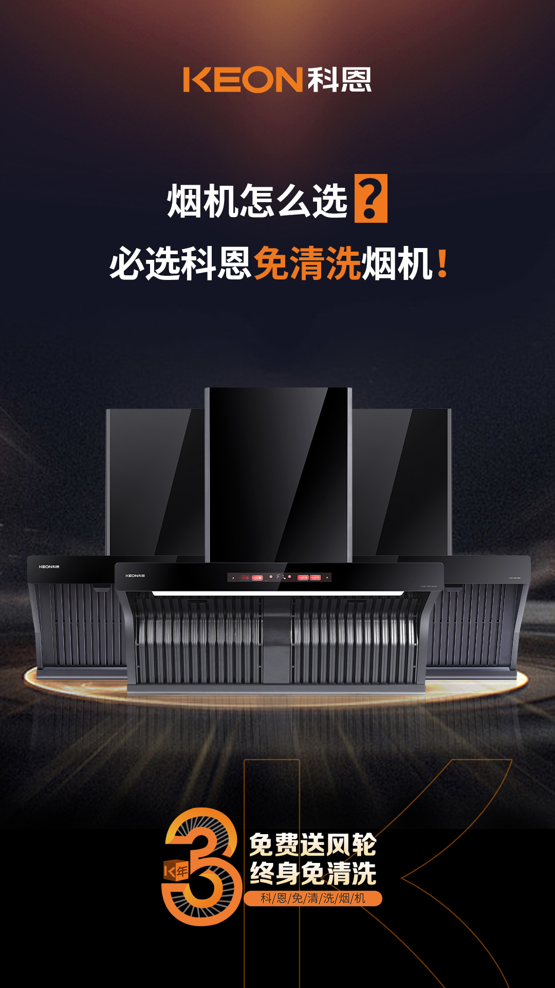 科恩電器行業(yè)率先提出3年免費(fèi)送風(fēng)輪服務(wù),徹底解決殘余油脂油污問題,真正實(shí)現(xiàn)煙機(jī)終身免清洗!
