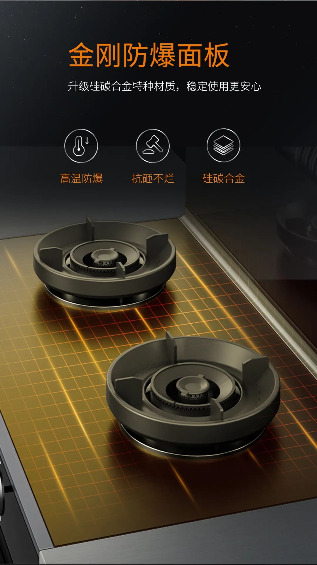 6K省心超體驗(yàn)一:抗砸防爆耐高溫,安全省心!防爆免清洗集成灶采用防爆金剛板解決廚房安全隱患!硅碳合金特種材質(zhì)可耐高溫1500℃,高于國標(biāo)3倍以上,更安全!
