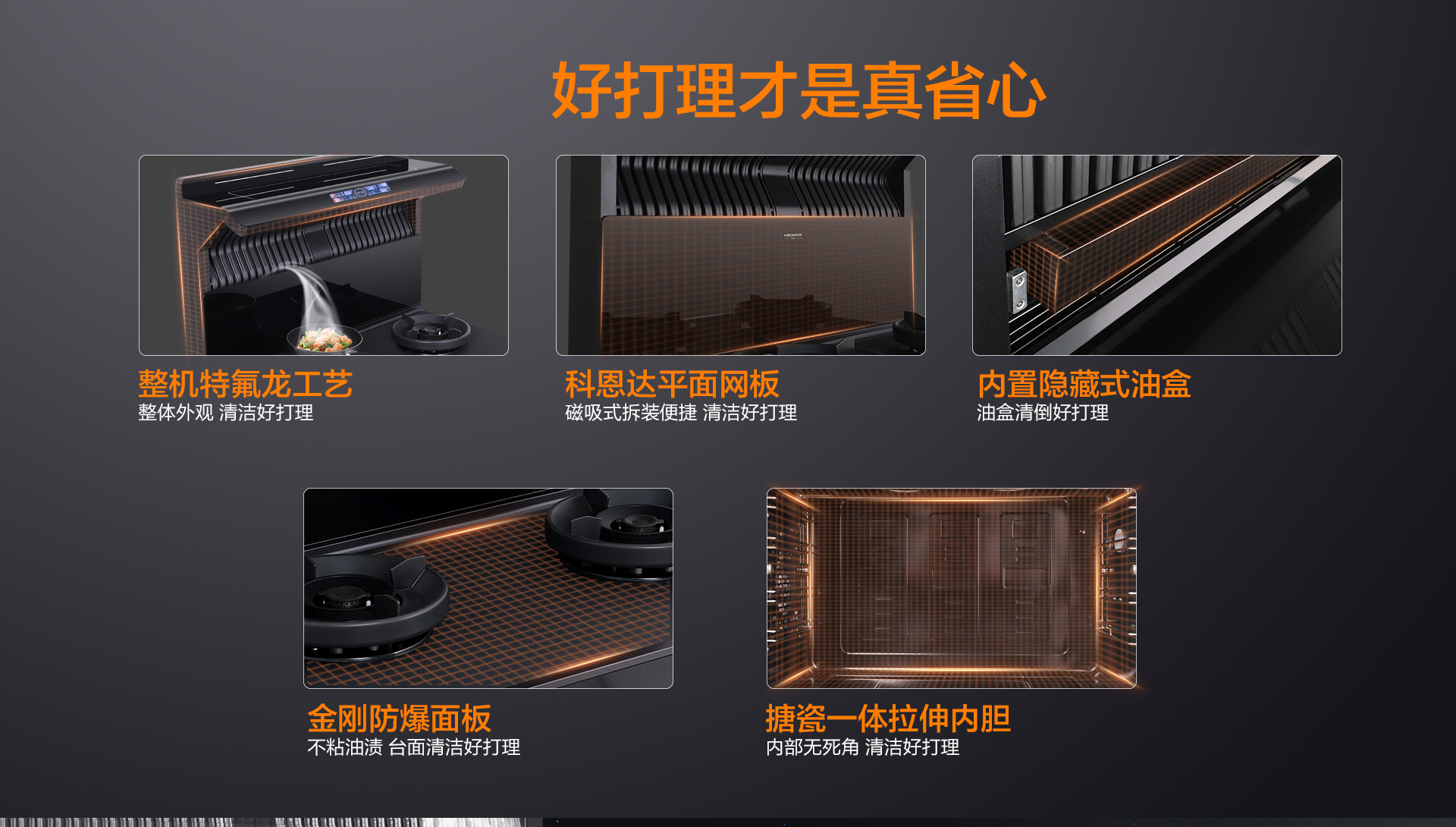 在工藝上經(jīng)過酸洗-噴砂工藝加之特氟龍噴涂最后高溫?zé)Y(jié),不僅不沾油、易清潔好打理。在分離油煙的同時(shí),還能防火阻燃!杜絕了明火進(jìn)入煙腔的可能,保障廚房安全!