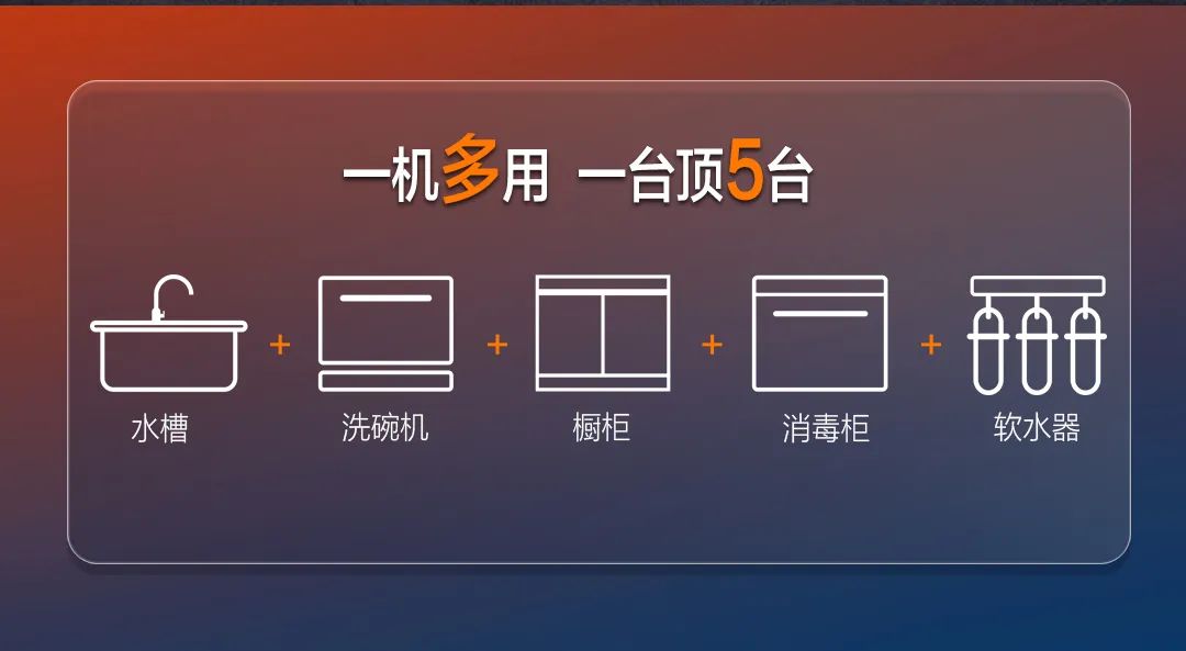 一臺集成水槽洗碗機(jī),相當(dāng)于:水槽+洗碗機(jī)+櫥柜+消毒柜+軟水機(jī)!一平方實(shí)現(xiàn)解放清洗自由,解放雙手就是現(xiàn)在!