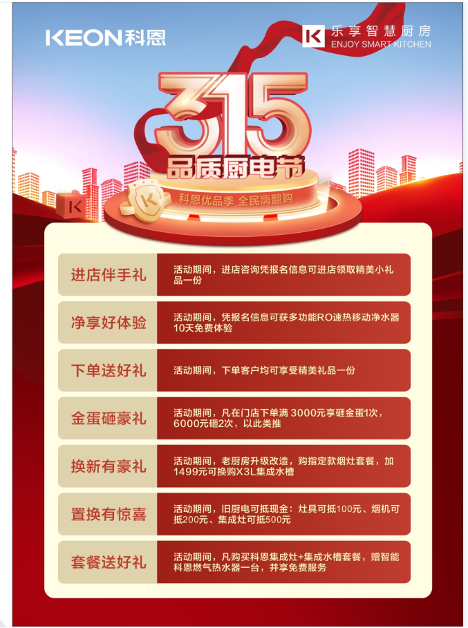 科恩“315品質(zhì)廚電節(jié)”正在火熱進(jìn)行中,全國千城萬店齊獻(xiàn)7重好禮,只為帶給您全新高品質(zhì)廚房生活。