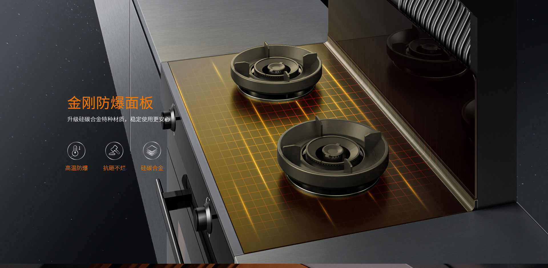 防爆金剛板解決廚房安全隱患!硅碳合金特種材質可耐高溫1500℃,高于國標3倍以上,更安全!安全省心的烹飪生活,就從科恩G500開始!