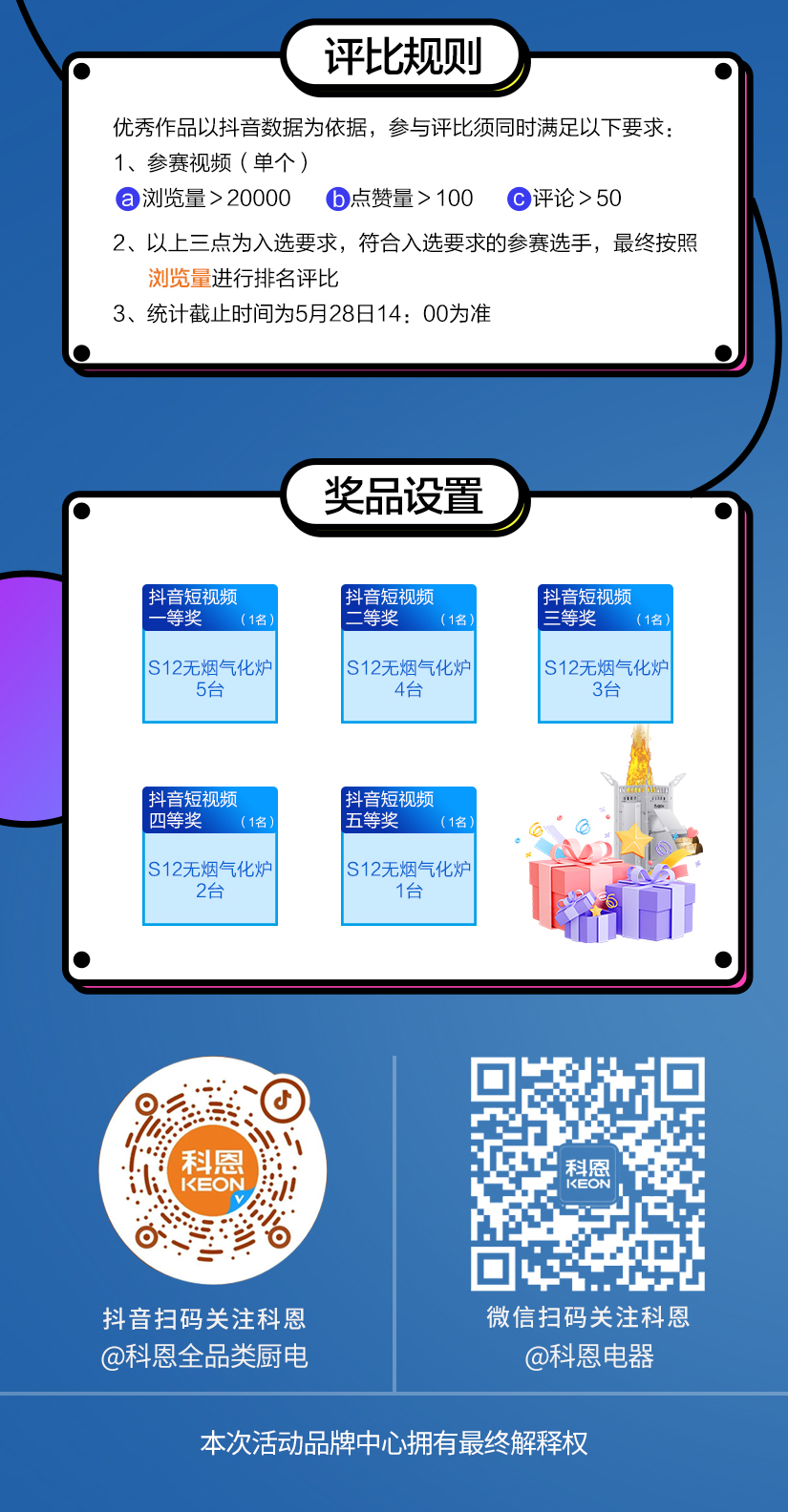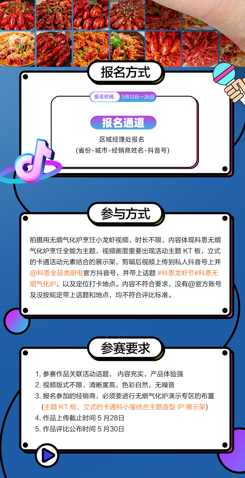 五月的煙火氣,藏在小龍蝦肥美的蝦鉗里,藏在氣化爐的勁焰猛火中,爐力全開,鉗動江湖。5 月12日——5月26日,一場舌尖與視覺的雙重盛宴拉開序幕!科恩龍蝦節(jié)抖音短視頻PK大賽重磅來襲,誠邀全國科恩專賣店,共赴這場創(chuàng)意與實力的較量,用鏡頭記錄無煙料理的無限可能。