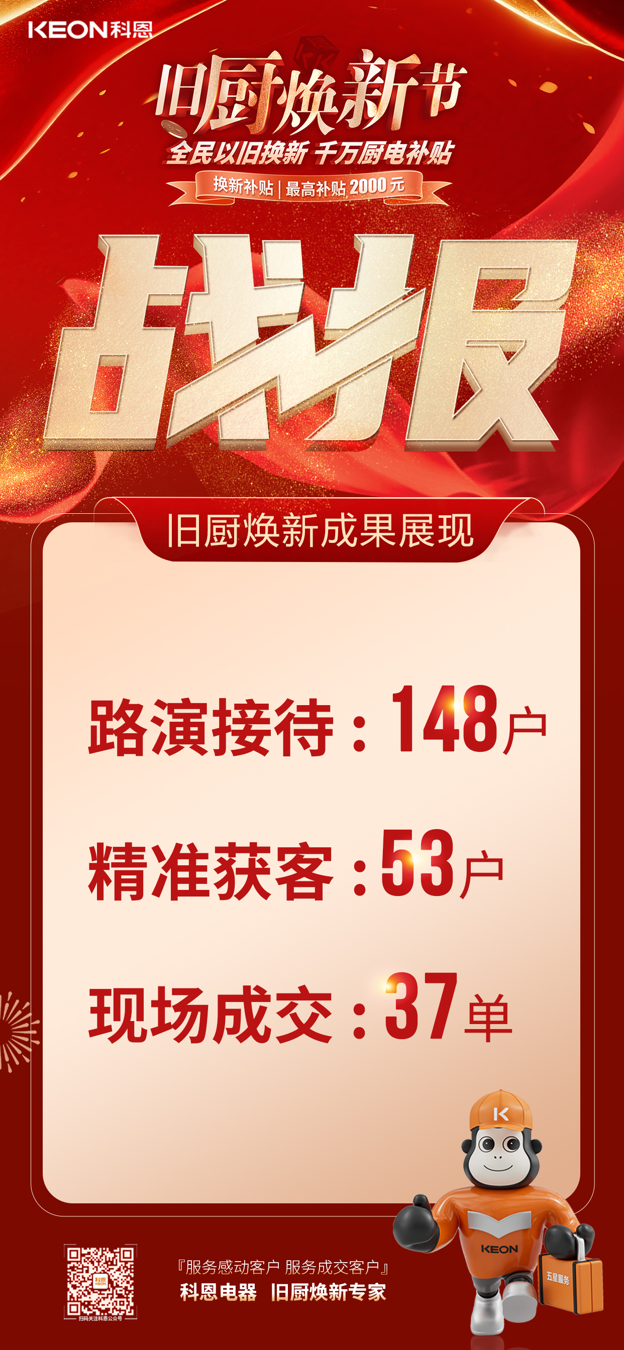 截止目前,科恩舊廚煥新路演活動(dòng)在河南、河北、江蘇、安徽、湖南等部分城市開展,為期17天,各地陸續(xù)進(jìn)行1-3天的路演,數(shù)據(jù)統(tǒng)計(jì)共接待148戶,精準(zhǔn)獲客53戶,現(xiàn)場(chǎng)成交37單,轉(zhuǎn)化率達(dá)25%,取得佳績(jī)。通過政企補(bǔ)貼降低消費(fèi)門檻,讓用戶現(xiàn)場(chǎng)體驗(yàn)智能廚電升級(jí)價(jià)值,同時(shí)為經(jīng)銷商打造營(yíng)銷樣板,推動(dòng)行業(yè)綠色消費(fèi)升級(jí)。