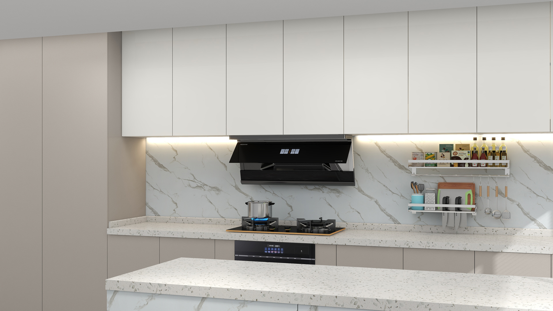 在設(shè)配性上,煙機(jī)7520突破傳統(tǒng)煙機(jī)安裝局限,采用365mm 小圍板結(jié)構(gòu),能夠完美適配多種尺寸的櫥柜。兼顧美學(xué)與實(shí)用性,全黑玻璃面板采用一體化成型工藝,不僅視覺上時(shí)尚大氣,適配現(xiàn)代簡(jiǎn)約、輕奢等多種廚房裝修風(fēng)格,且表面光滑易清潔,有效降低日常維護(hù)難度。操作層面,模塊化觸摸鍵布局清晰,功能標(biāo)識(shí)直觀,搭配揮手智控技術(shù),無需觸碰面板即可完成風(fēng)量調(diào)節(jié)等操作,既便捷又衛(wèi)生,滿足了不同年齡段用戶的使用需求。