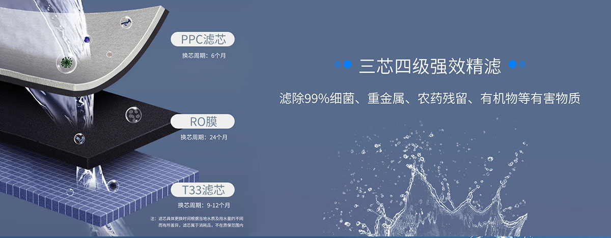 - 三芯四級(jí)強(qiáng)效精濾,濾除99%細(xì)菌重金屬