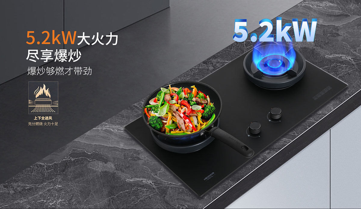 - 360°全維進風,立體補氧,5.2kW大火力盡享爆炒
